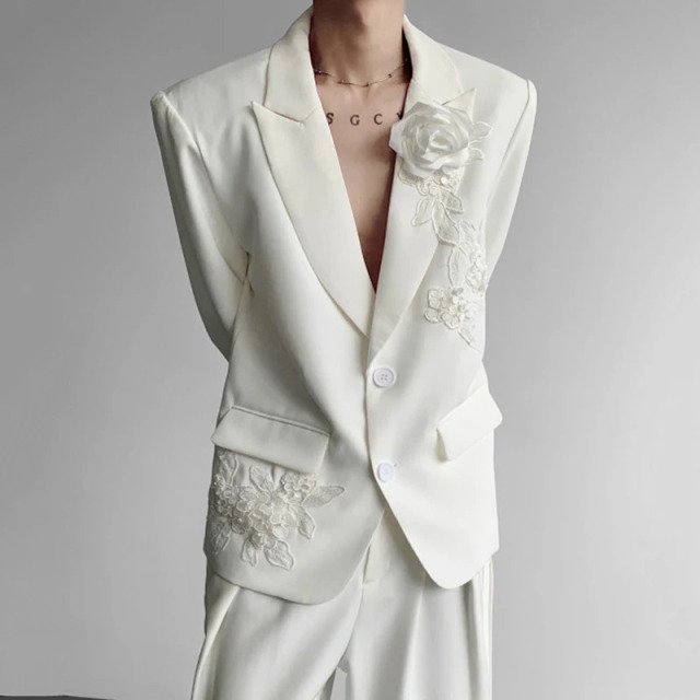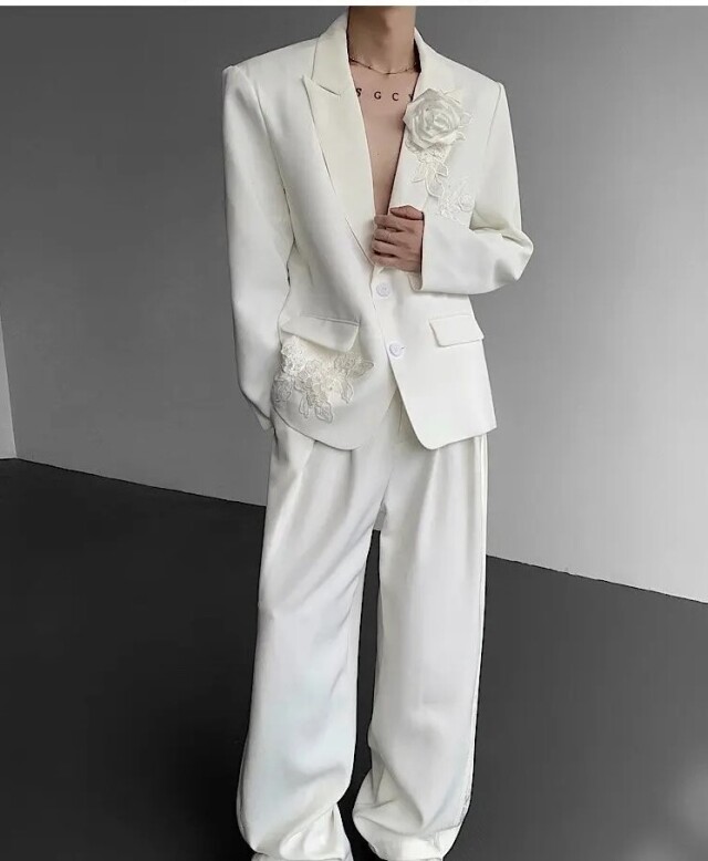 <BR> 高品質生地にワイドなフラワースーツを仕立てました、最新スーツデザインパターン!ワイドフレアーパンツにしたました、最新流行の生地でおしゃれにコーディネート、パーティーに、イベントに、結婚式パーティーに、普段使いに結婚式スーツに衣装に結婚式パーティーにホストジャケット、ビジネスカジュアルジャケット